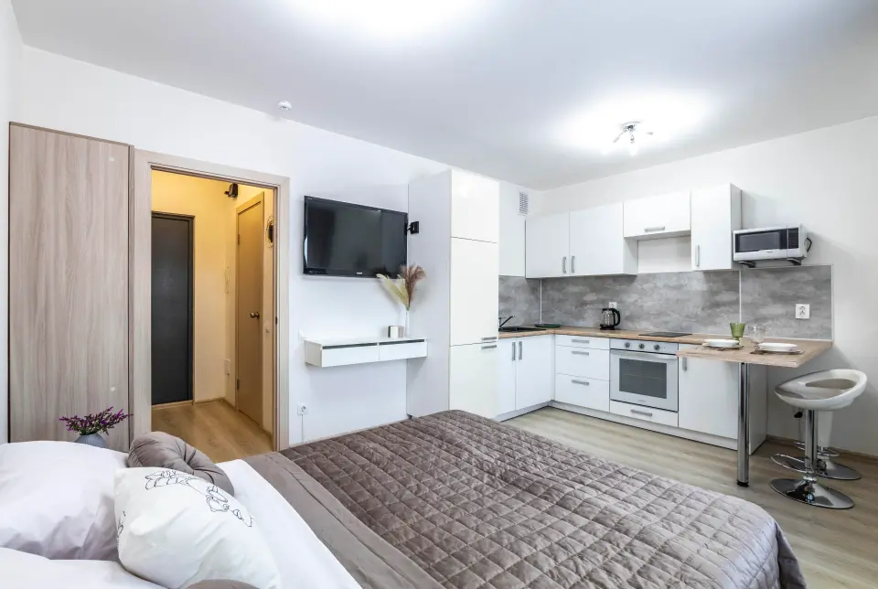 * Полноценная кухня (плита, духовка, микроволновка, чайник)