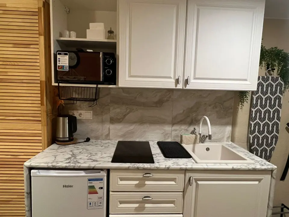 👍🏻 удобная обеденная и кухонная зона с набором посуды, плитой, микроволновой печью