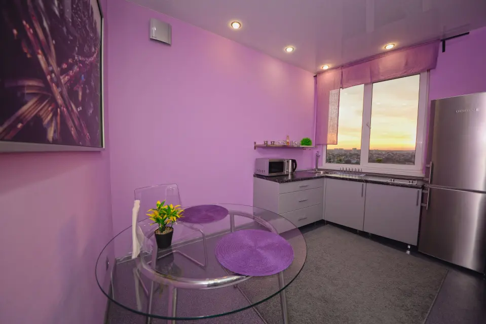 Кухня оснащена всем необходимым для вашего комфортного проживания: удобный кухонный гарнитур, холодильник, чайник, посуда, свч.