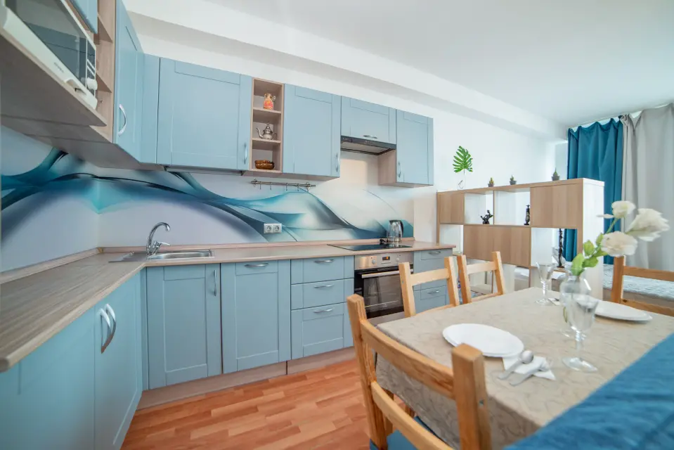 * Полноценная кухня (варочная панель, микроволновка, чайник)