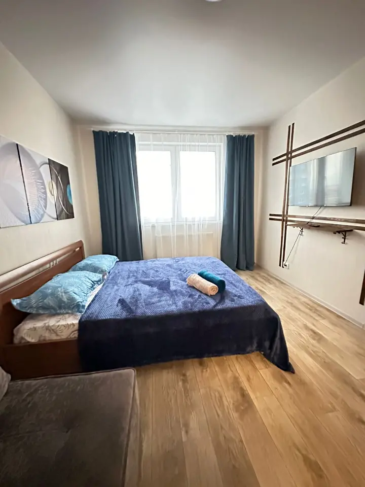 Однокомнатная квартира на высоком этаже. 3 спальных раздельных места. Двуспальная кровать , диван и софа .
