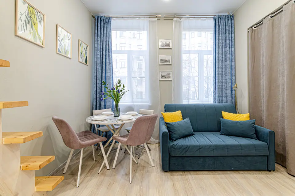 Компактное, но стильное пространство: уютная кровать, мини-кухня, душ, быстрый wi-fi — всё в одном ритме.