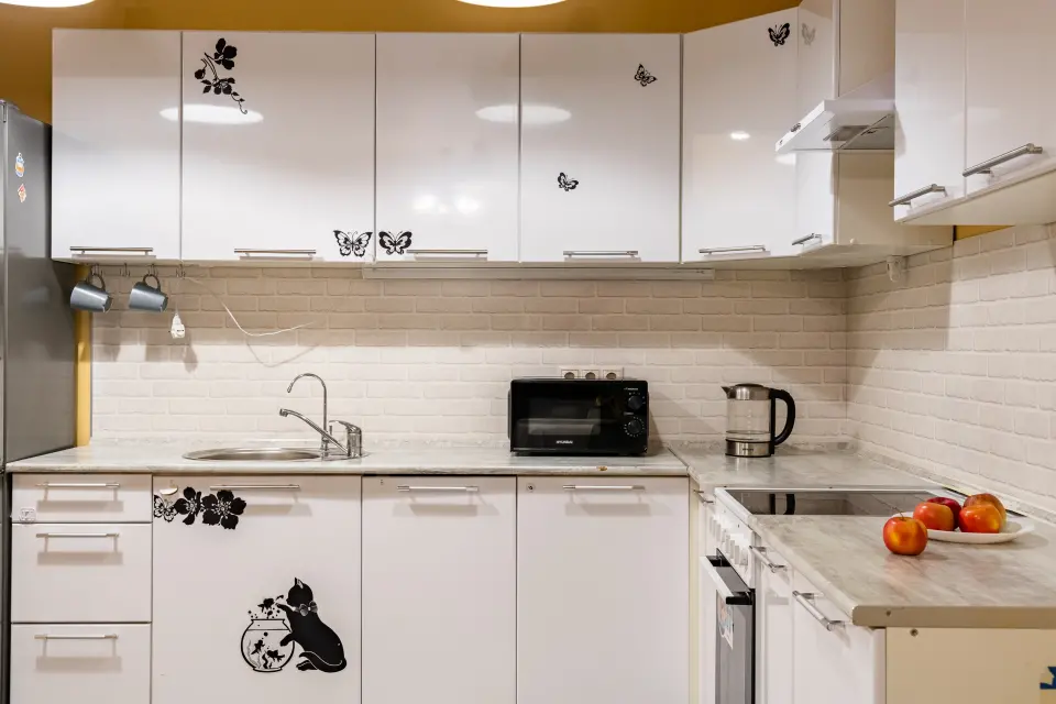 • Бытовая техника: холодильник, плита, духовой шкаф, стиральная машина, микроволновая печь, утюг и фен.
