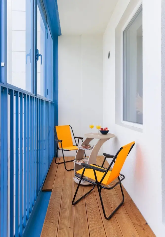 • Зона отдыха с комфортными креслами, журнальным столиком и модными журналами на балконе с панорамным остеклением