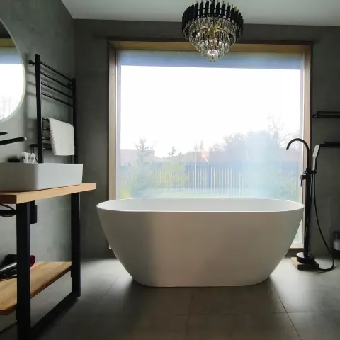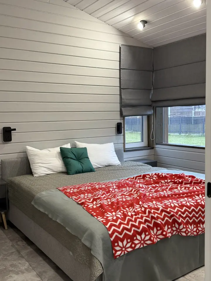 - Мастер спальня с большой кроватью и ортопедическим матрасом 160*200. С панорамным окном Smаrt-стекла (автоматическое затемнение) и видом на лес;