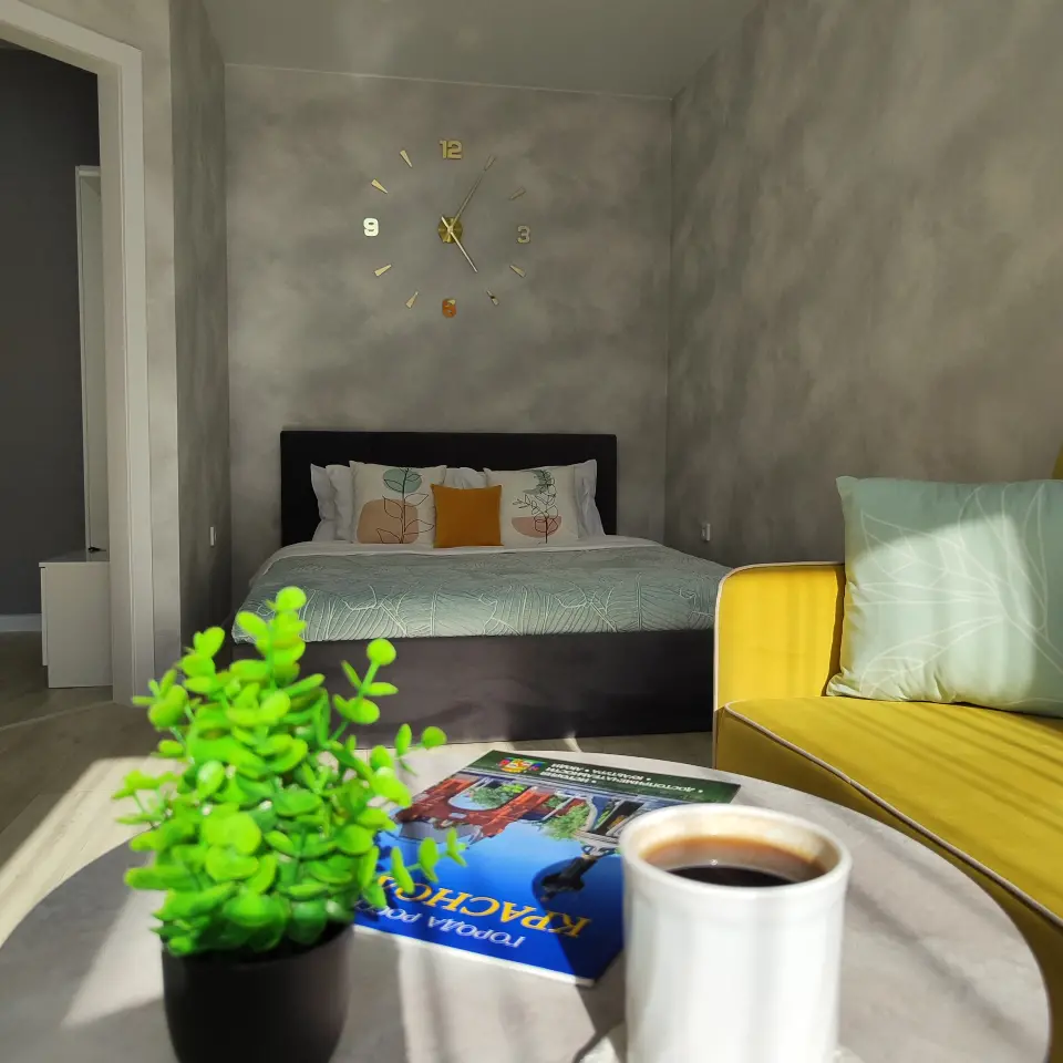 💛 Расслабьтесь на большой, просторной двуспальной кровати с белоснежным бельём и удобным ортопедическим матрасом. Или отдохните после насыщенного дня на современном раскладном жёлтом диванчике, наслаждаясь просмотром любимых фильмов на нашем телевизоре SMART-TV🛜📺.