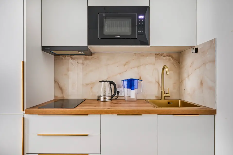 - Кухня со всей необходимой техникой: холодильник, плита, чайник, микроволновая печь, стиральная машина, гладильные принадлежности