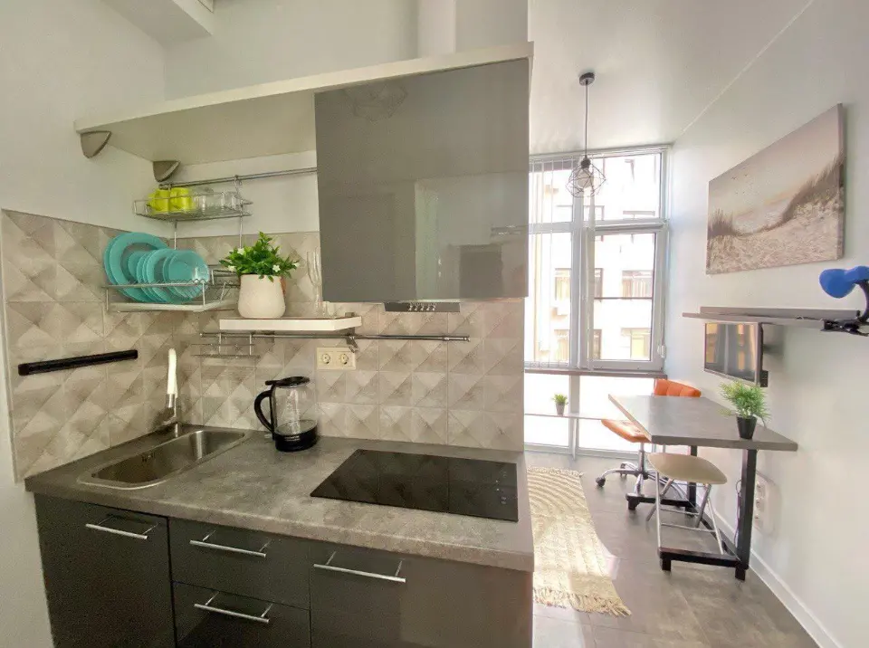 - Удобная обеденная и кухонная зона, плита, духовой шкаф, холодильник, микроволновая печь, чайник, набор посуды, фильтр для воды, чистящие средства;