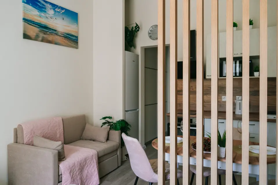 - Гостиная: Смарт TV с Netflix, диван-кровать и высокоскоростной Wi-Fi.