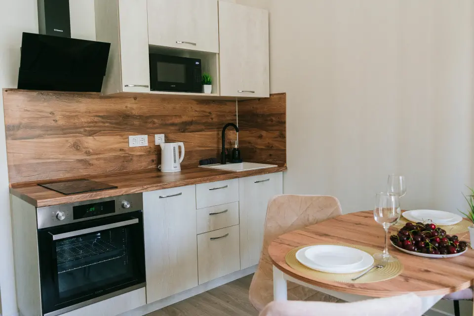 - Кухня: Вся техника (микроволновка, варочная панель, чайник), посуда и «стартовый набор» (чай, кофе, сахар).