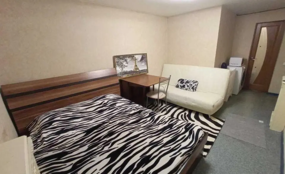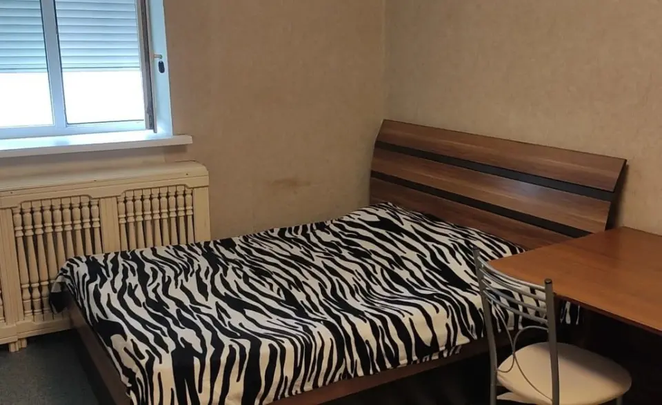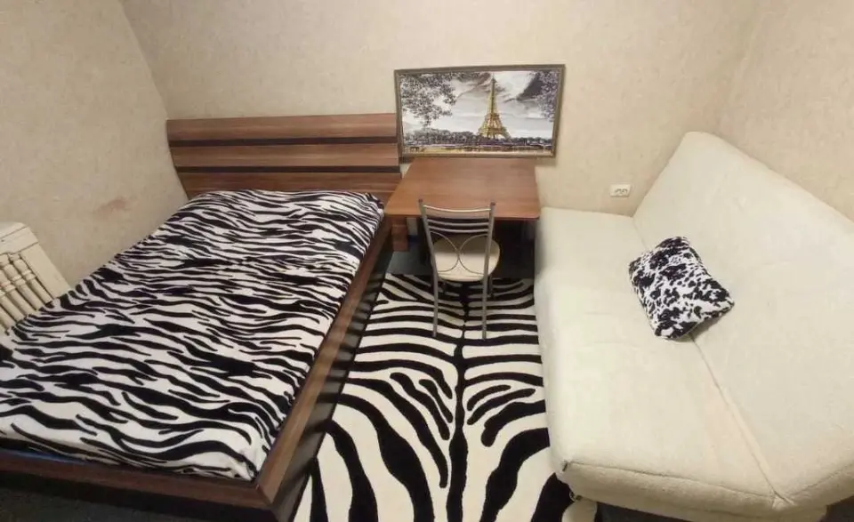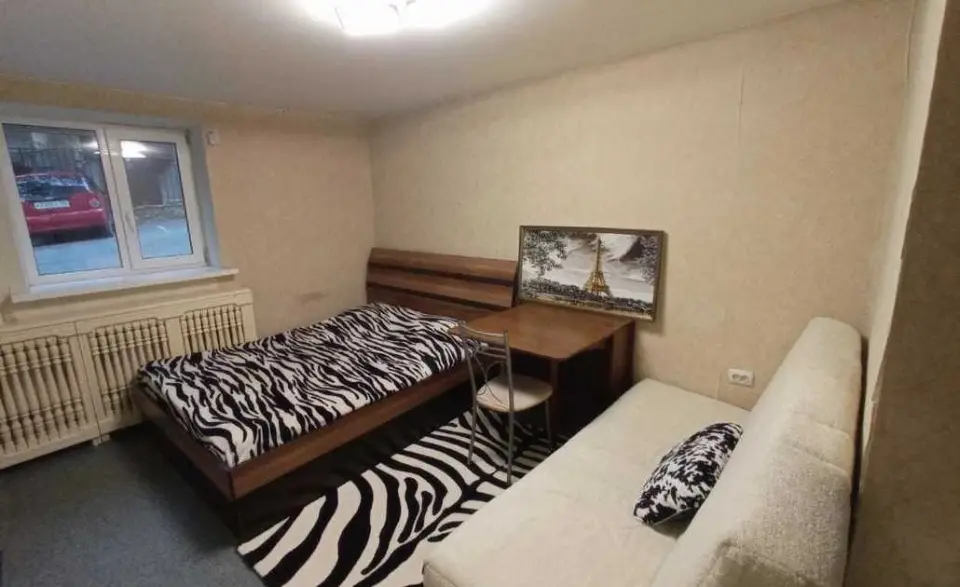 Небольшая двухкомнатная квартира. Первый этаж многоэтажки с отдельным входом с улицы. Комнаты проходные, между ними арка. Вторая комната маленькая, с полноразмерной двухъярусной кроватью.
