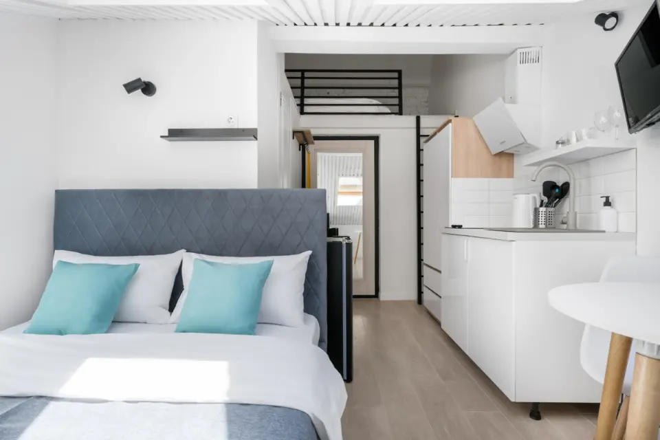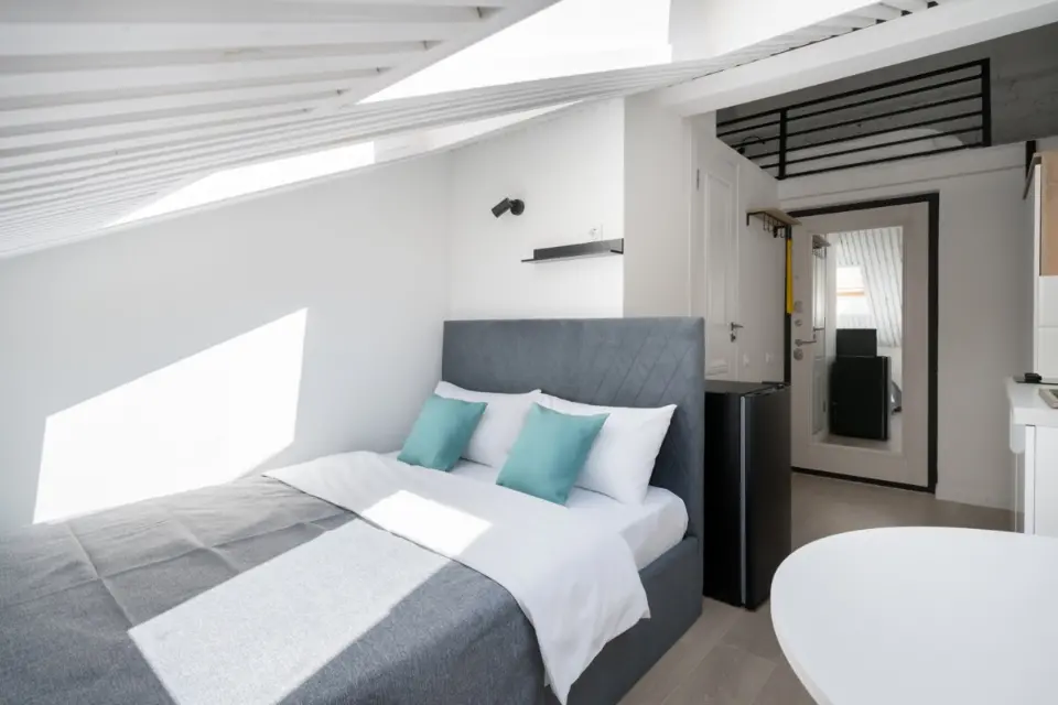 Оптимальная комплектация для комфортного проживания: собственная кухня, высокоскоростной WI-FI, телевизор. Студия располагается на мансардном этаже.