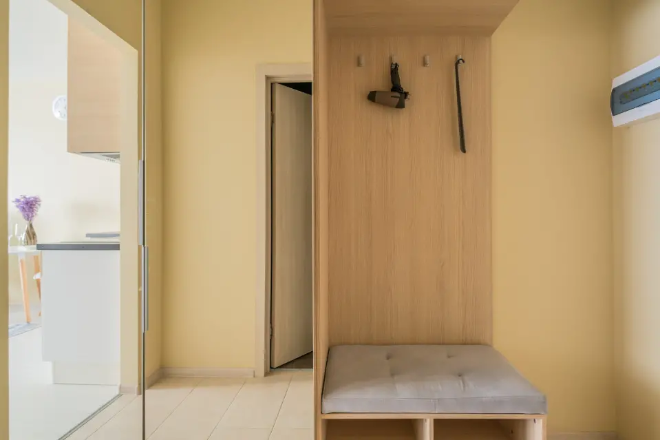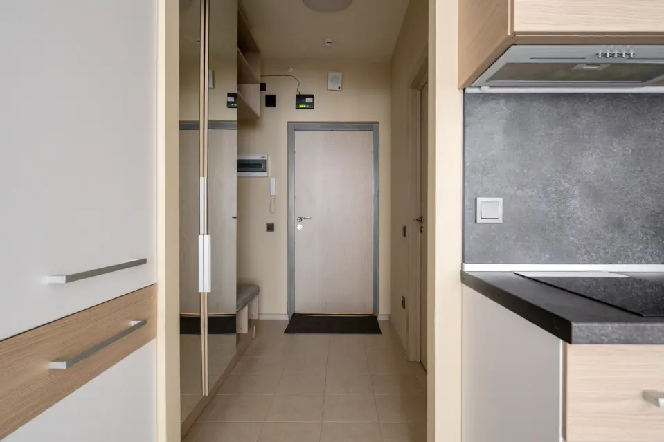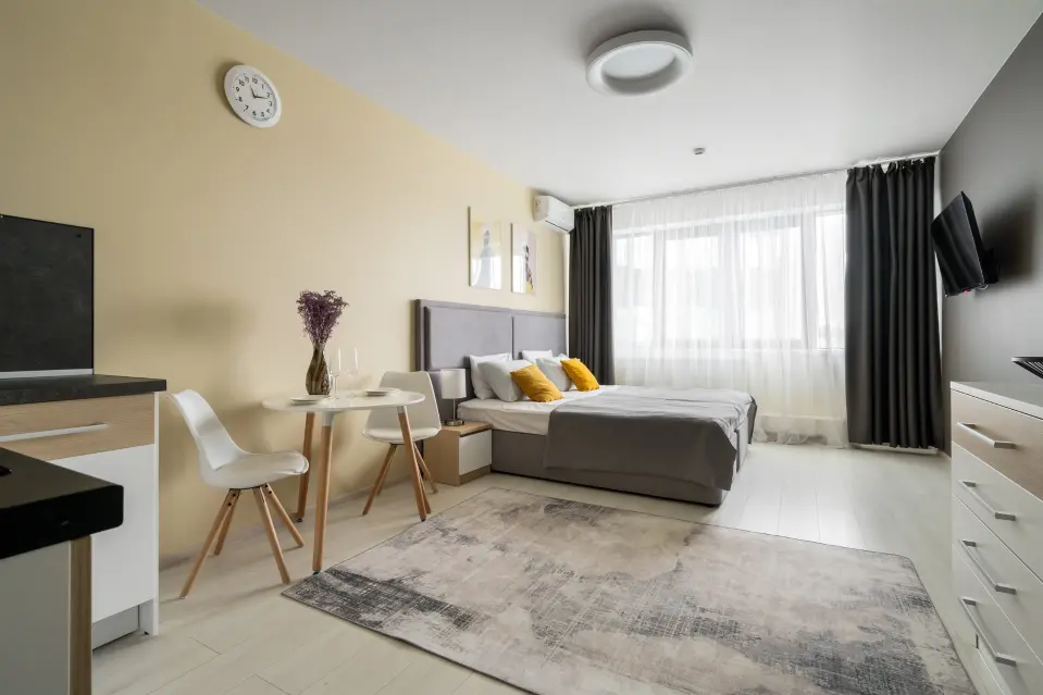 В студии есть все необходимое для комфортного проживания: двуспальная кровать (или две раздельные кровати); тв, обеденный уголок, комод, мини-кухня со свей необходимой техникой (стиральная машина, посудомоечная машинка, плита) и кухонной утварью. В зоне прихожей вместительный гардероб. Совмещенный санузел с душем и туалетом. Утюг, гладильная доска представляются. Свежее постельное белье и полотенца предоставляются.