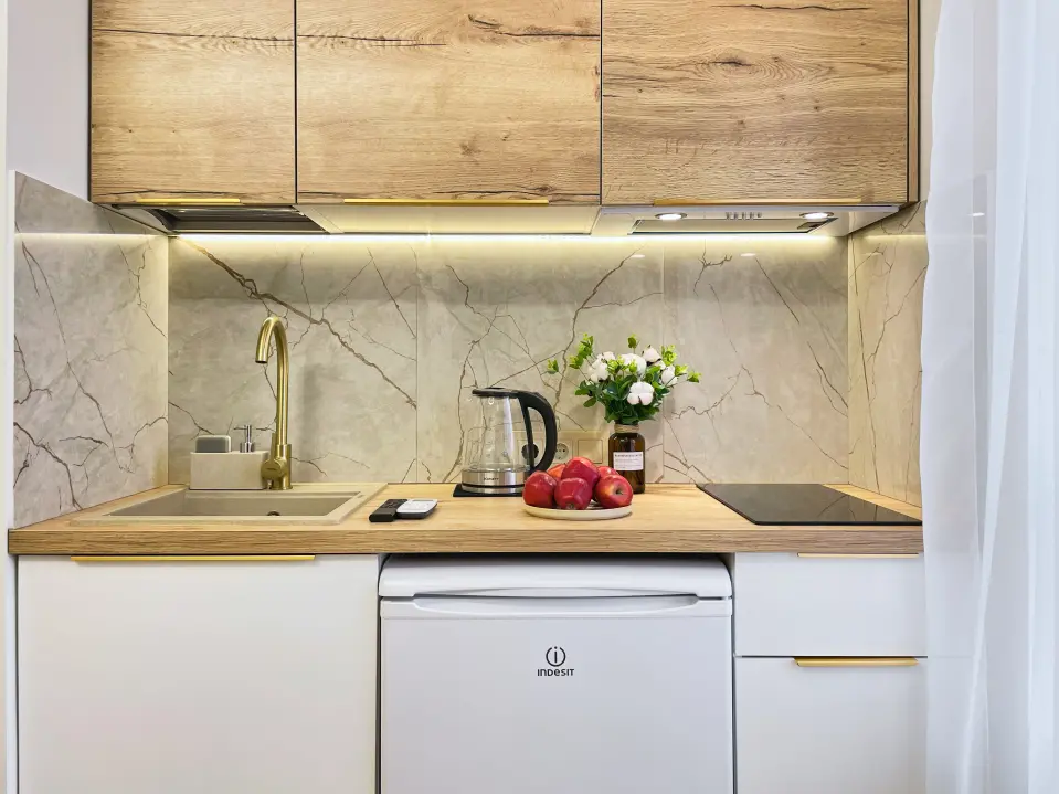 👍🏻 удобная обеденная и кухонная зона с набором посуды, плитой, микроволновой печью