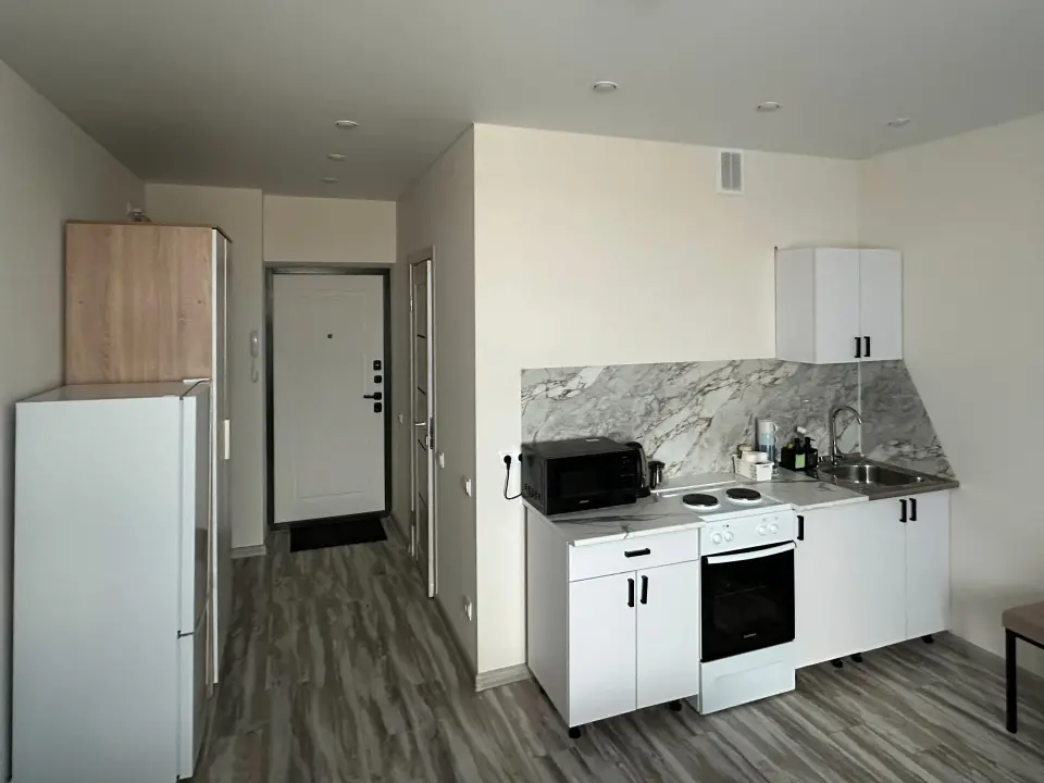 - Полностью оборудованная кухня: варочная панель, микроволновка, чайник
