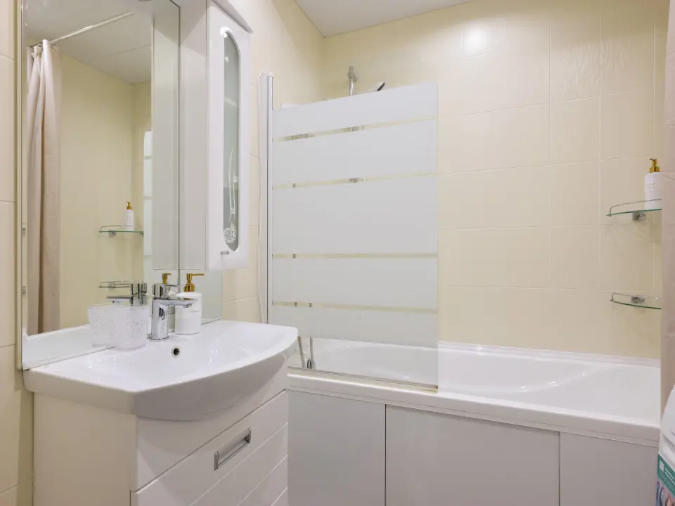 -Раздельный санузел, где есть ванна и туалет. Стиральная машинка, утюг и фен для вашего удобства.