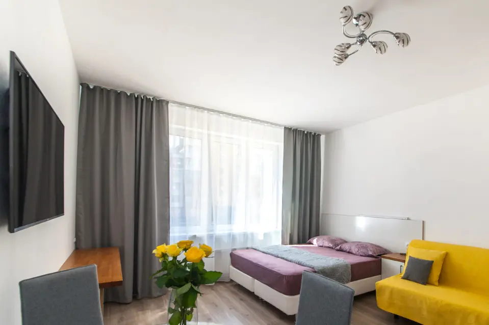 Уютная студия вмещает до 4-ти гостей и находится на 2 этаже дома бизнес-класса. Новый комплекс бизнес-класса располагается в одном из красивейших мест Московского района, рядом с Пулковским паркм. В квартире есть все необходимое для комфортного проживания: двуспальная кровать, раскладной диван, телевизор, кухонная зона со всем необходимым, совмещенный санузел.