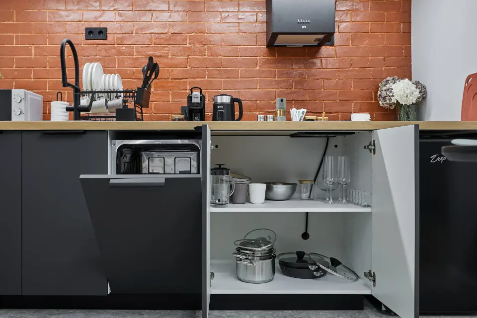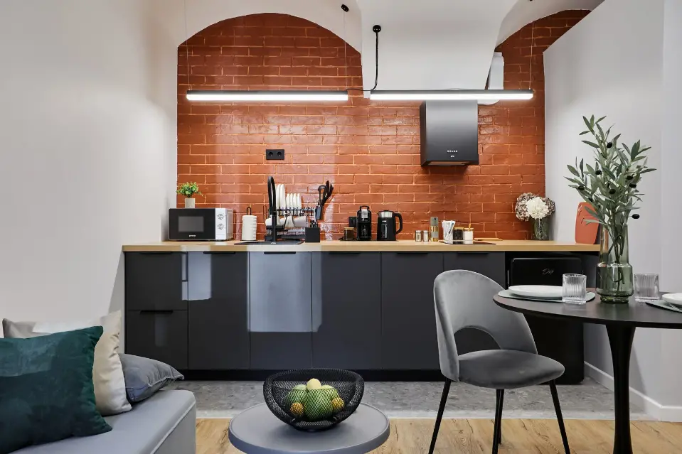 - Полностью укомплектованная кухня ➡️ индукционная плита, посудомоечная машина, чайник/кофеварка, микроволновая печь, холодильник + посуда и столовые приборы, обеденная зона.