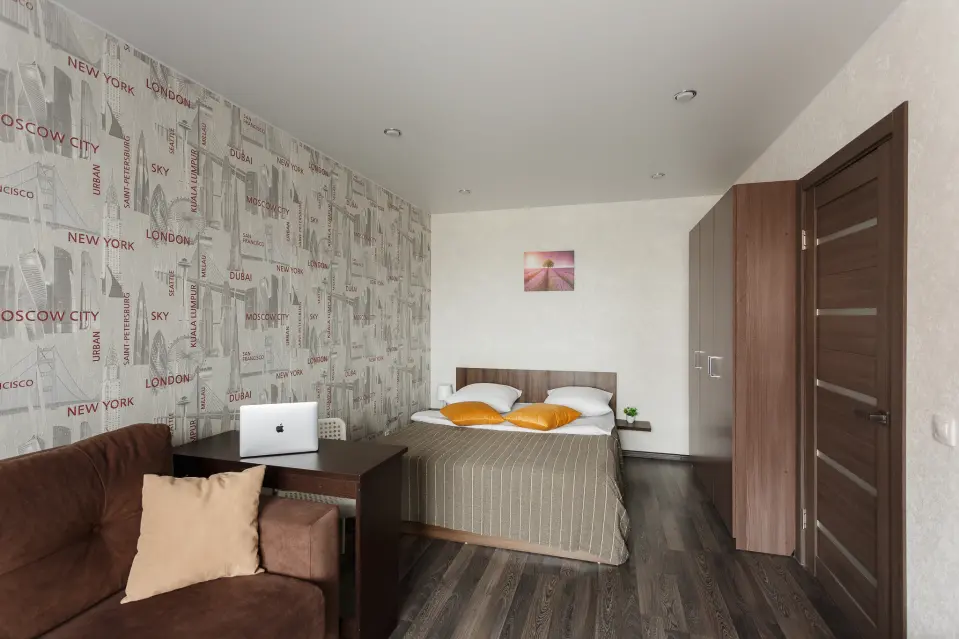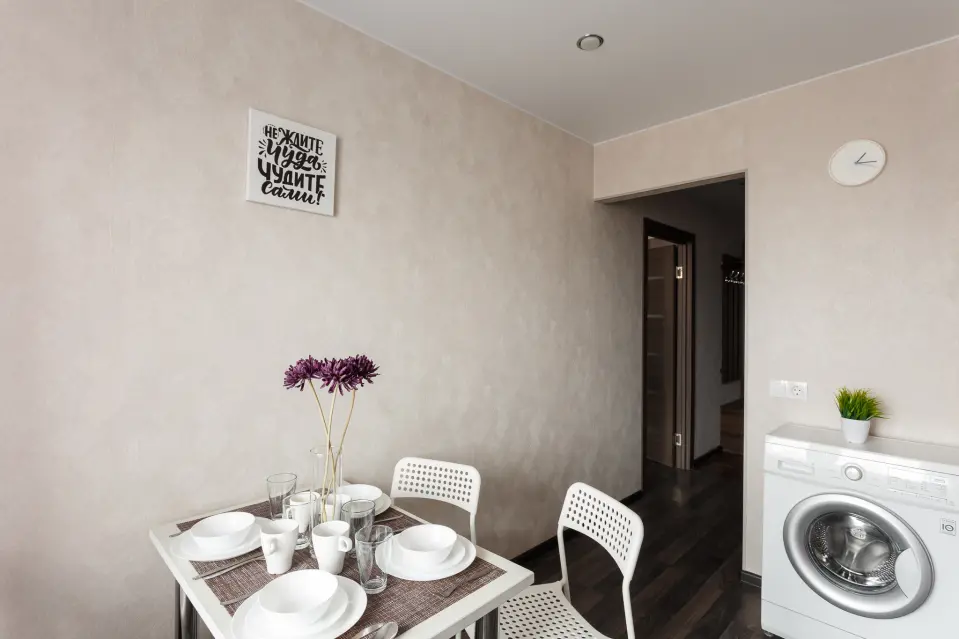 Ощущение, что это квартира мечты: уютная кухня готова вдохновлять вас на кулинарные подвиги, а гостиная – идеальное место, чтобы зарыться в подушки и мечтать о следующем отпуске. Стены, украшенные названиями городов, намекают, что вы оказались в самом эпицентре моды и стиля, пусть даже на пару дней.