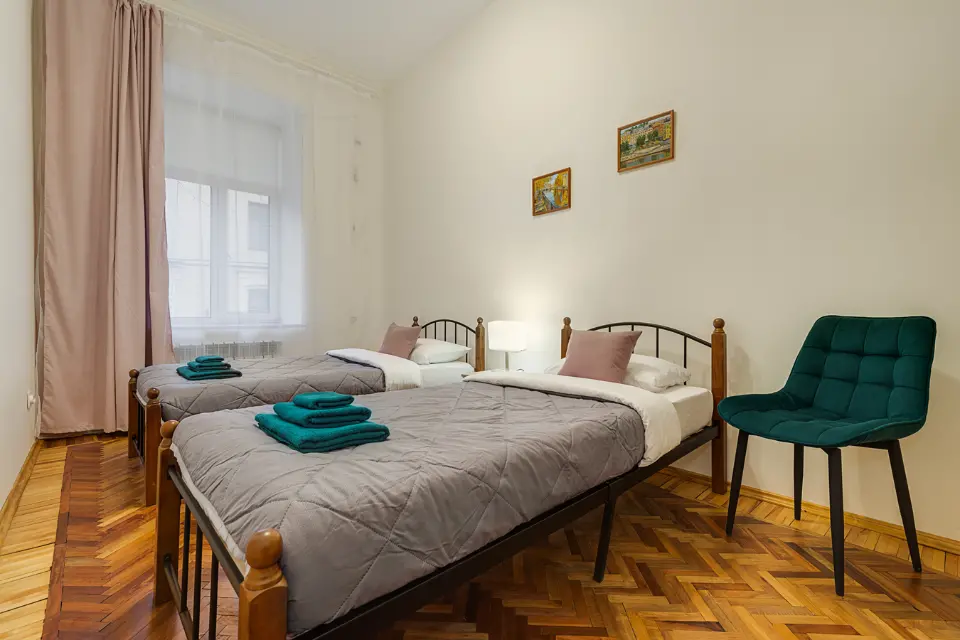 Удобства: четыре односпальные кровати и двуспальная кровать, заправленная свежим постельным бельём.