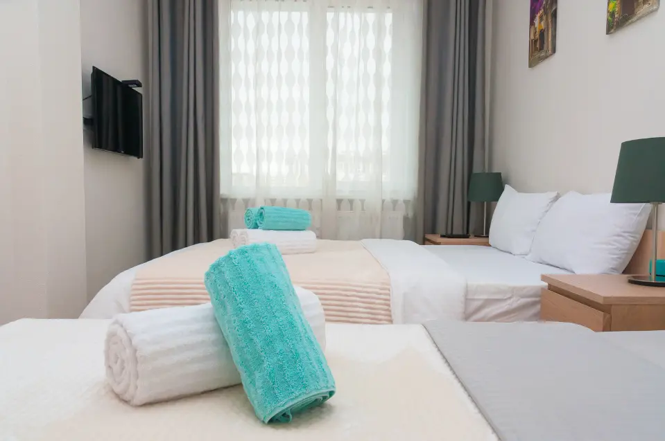 - одна двуспальная и одна односпальная кровати в комплекте с ортопедическим матрасом и гипоаллергенным постельным бельем,