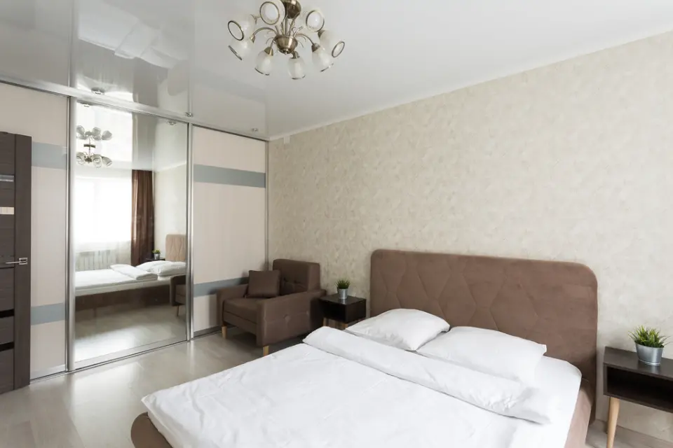 Просторная спальня с двуспальной кроватью обеспечит вам спокойный сон, а современный интерьер будет радовать глаз. Большие зеркальные шкафы помогут удобно разместить все ваши вещи. В зоне отдыха вас ждет мягкое кресло, где можно расслабиться и почитать книгу или использовать как полноценное спальное место.