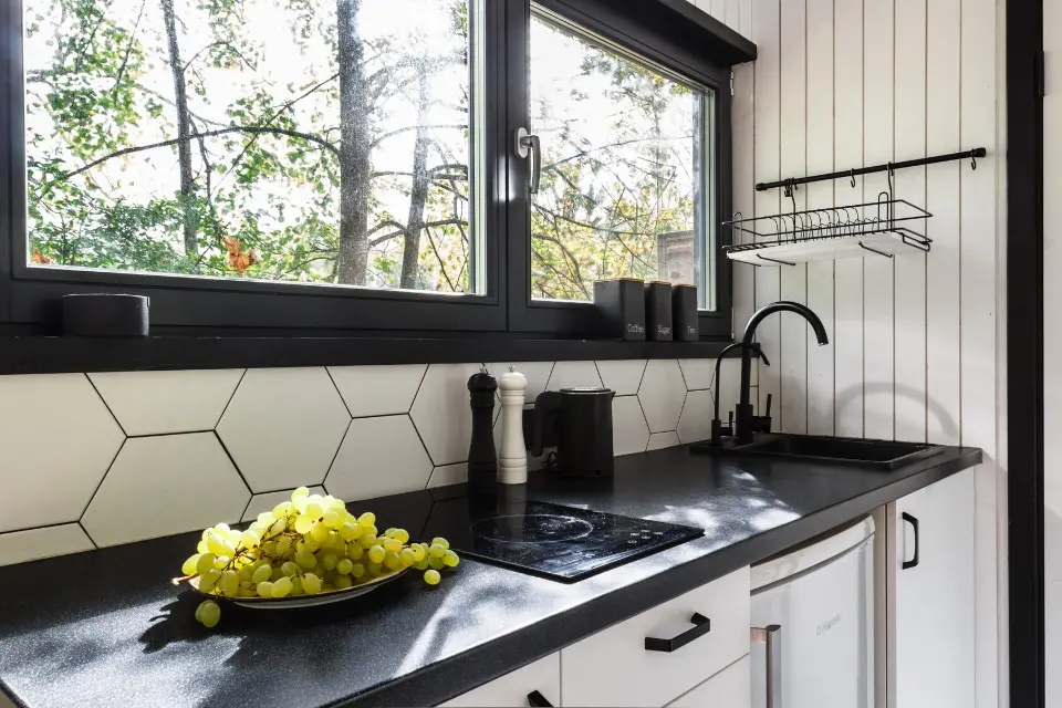 В доме есть все для комфортного отдыха – кондиционер, холодильник, гейзерная кофеварка, кофемолка, варочная панель, чайник, посуда на 2 персоны, а также соль, сахар, кофе, растительное масло.