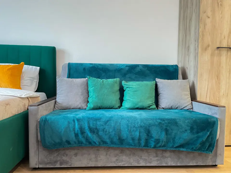 Спальные места - двуспальная кровать с ортопедическим матрасом и небольшой диван.