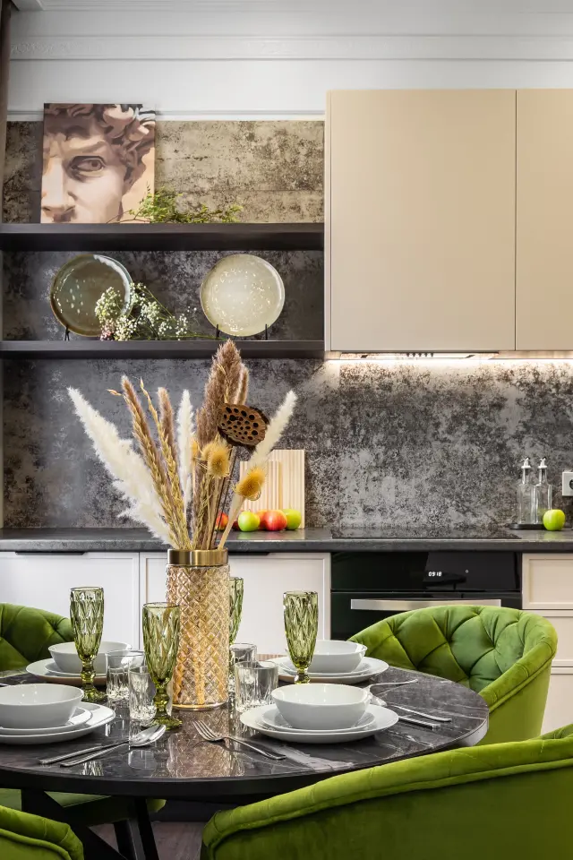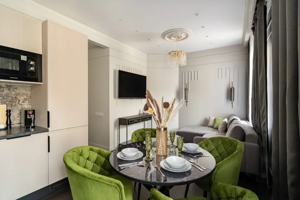 - Полностью укомплектованная кухня, индукционная плита, посудомоечная машина, чайник, капсульная кофемашина, духовка, микроволновая печь, холодильник, посуда и столовые приборы