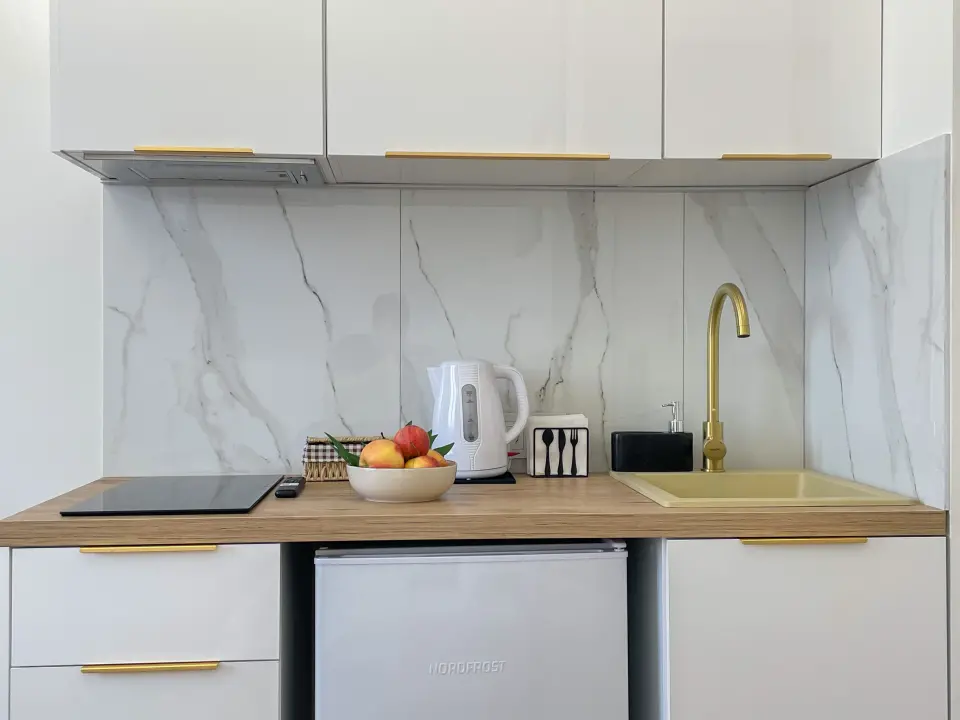 👍🏻 удобная обеденная и кухонная зона с набором посуды, плитой, микроволновой печью