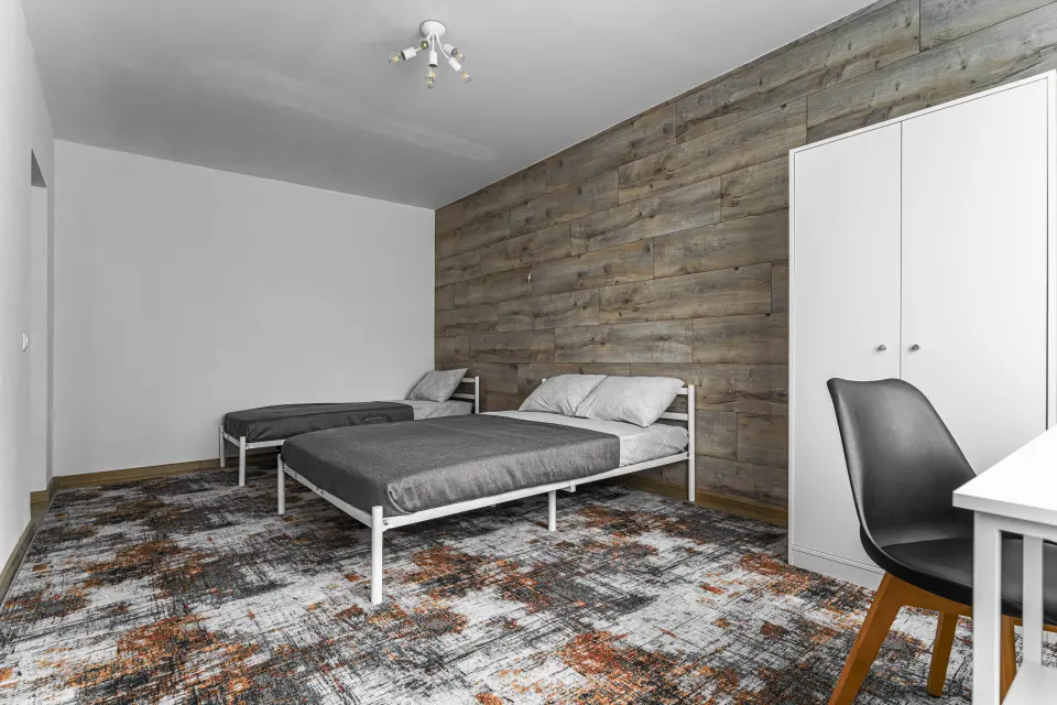 -Комфорт и удобства: В спальне двуспальная кровать с ортопедическим матрасом и 1,5 спальная кровать. Вместительный шкаф, стол для работы и стул;