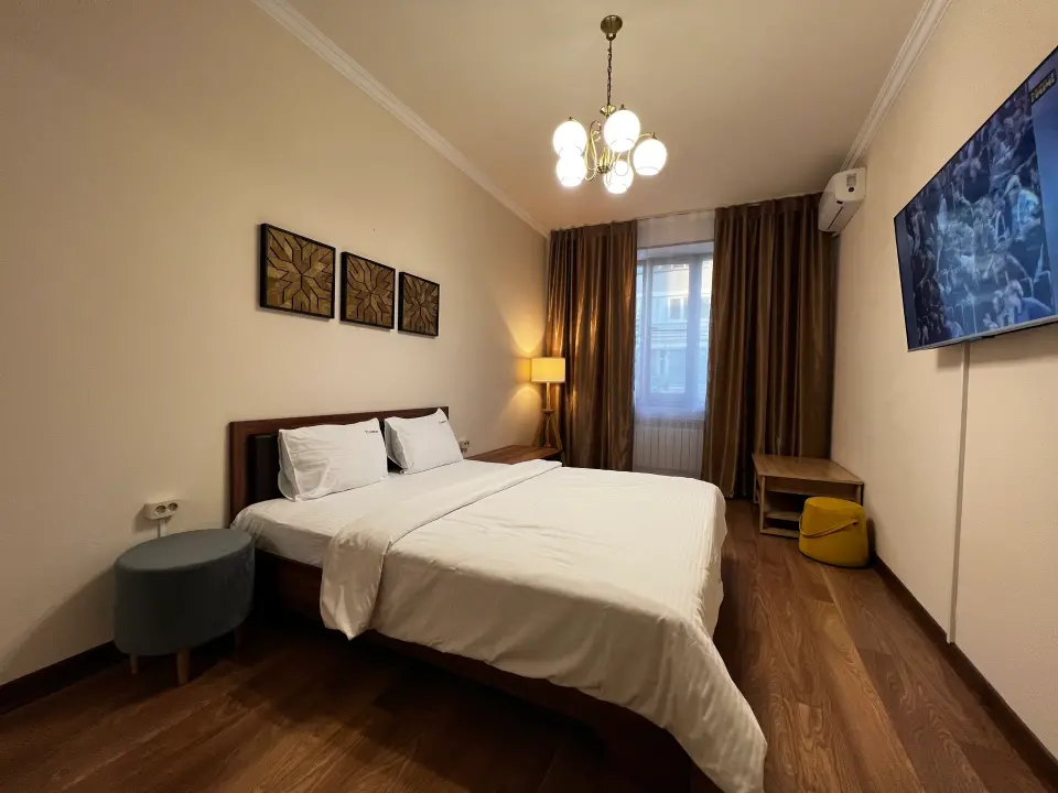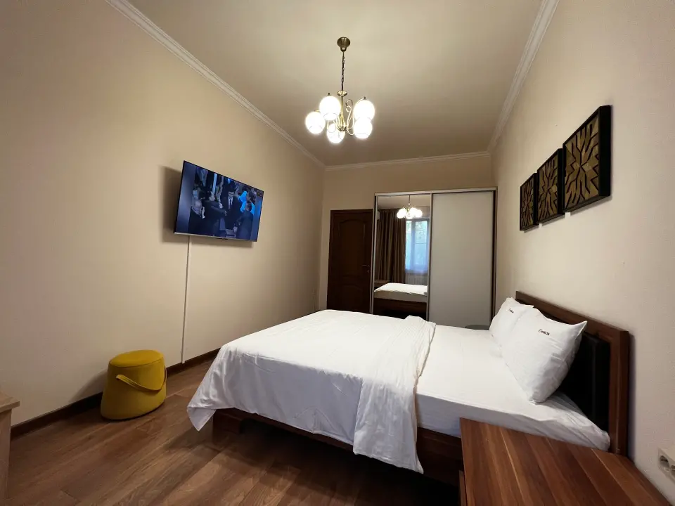 Особенность планировки — раздельное размещение спальных мест (кровать в комнате и диван на кухне) обеспечивает дополнительный комфорт и приватность для каждого гостя.