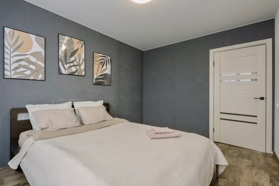 Удобства: двуспальная кровать с ортопедическим матрасом и двуспальный диван, заправленные свежим постельным бельём