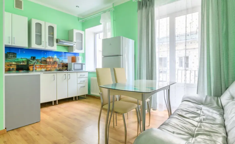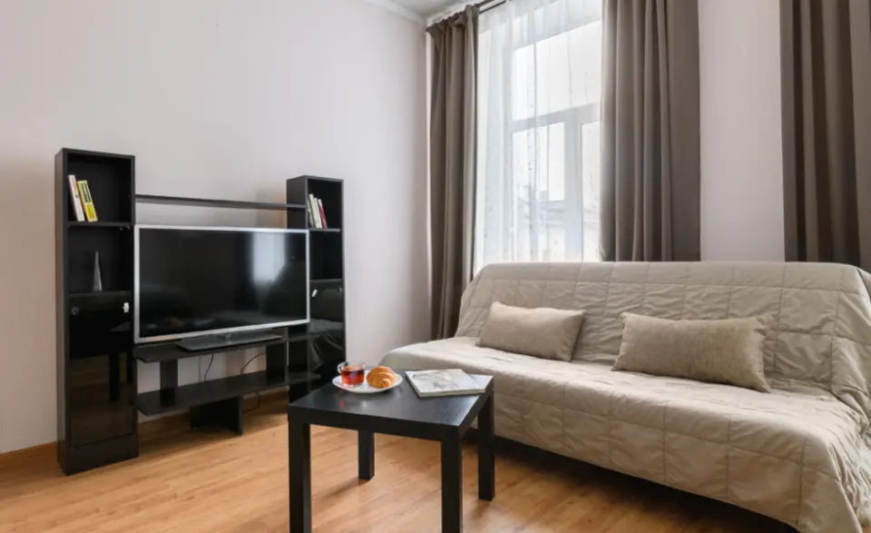 Светлая и уютная 1-комн. квартира, оборудованная всем необходимым для комфортного проживания. Окна выходят во двор, поэтому к квартире очень тихо, несмотря на близость Невского проспекта. Есть балкон.