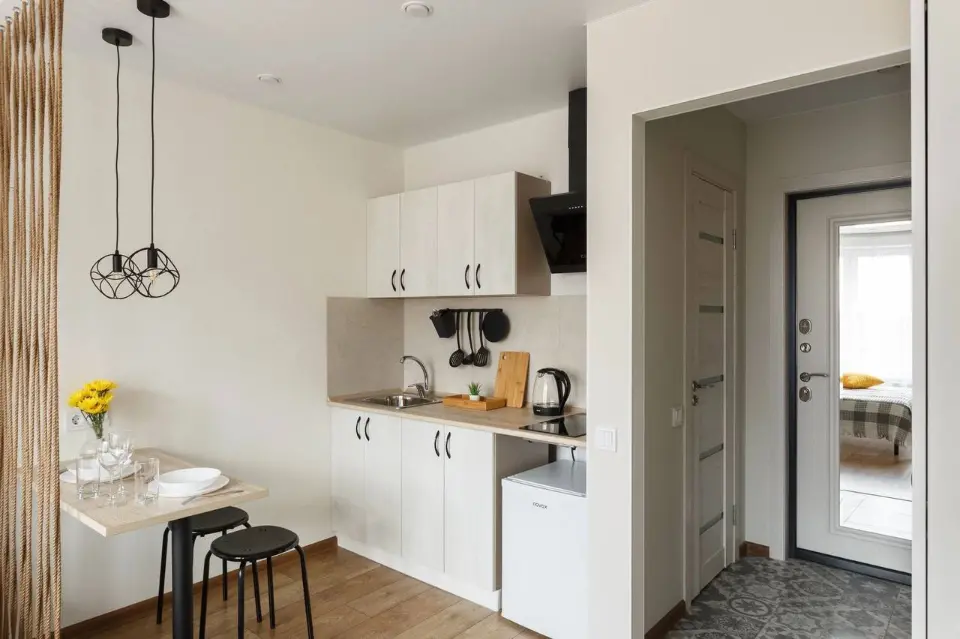 Кухонная зона оборудована всем необходимым для приготовления вкусных домашних блюд — это идеальный вариант, если вы предпочитаете готовить сами.