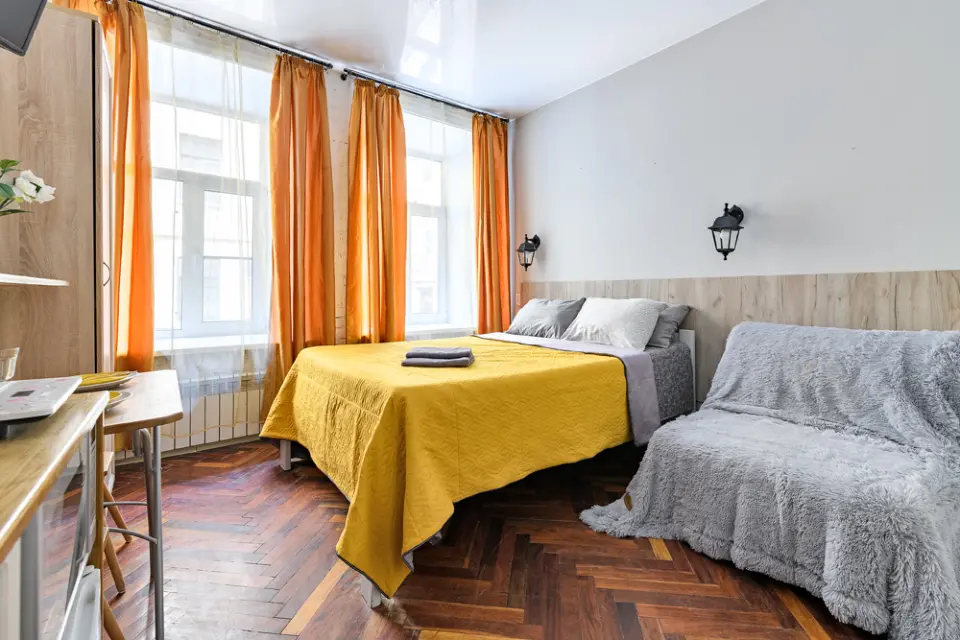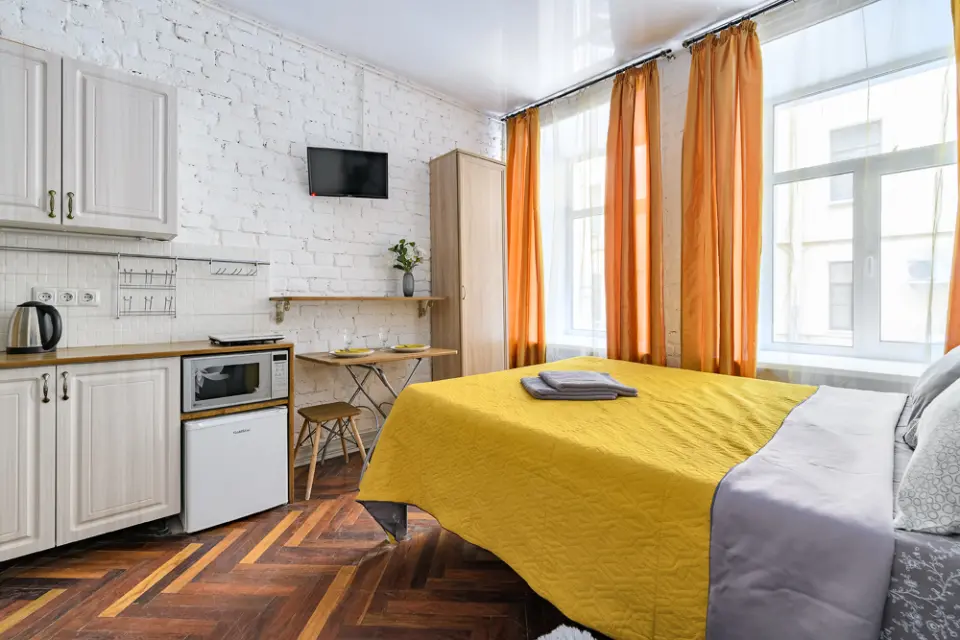 Студия с современным и практичным ремонтом вмещает до 3 гостей. В квартире есть все необходимое для комфортного проживания: двуспальная кровать, диван, шкаф, тумба, мини-кухня, санузел.