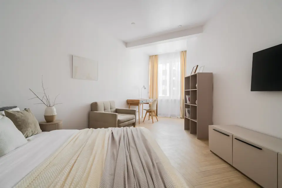 Комфорт и удобства: Для Вас есть всё необходимое для комфортного проживания:Удобная двуспальная кровать с ортопедическим матрасом, два раскладных дивана. Современный ЖК-телевизор для просмотра любимых программ и фильмов. Система для хранения вещей;