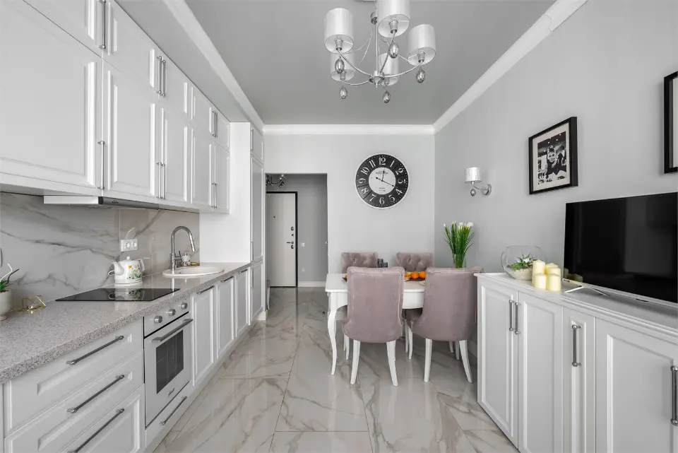 - Стильная кухня в полной комплектации, будто приглашает приготовить что-то вкусное и провести время за уютным ужином. Мини-бар позволит вкусно перекусить в перерыве между делами.