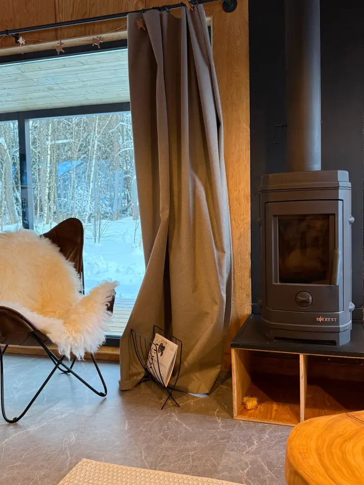 ▪ просторная кухня-гостиная с большим раскладным диваном и камином. Панорамные окна дома выходят на лес и большую террасу.