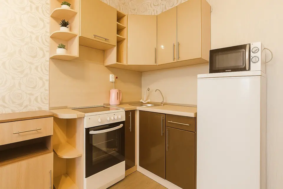- Посуда и кухонные принадлежности: кастрюли, сковородки, тарелки, чашки, бокалы, стаканы, столовые приборы — всё для удобного приготовления пищи и комфортного приема пищи