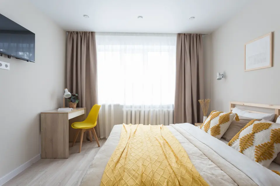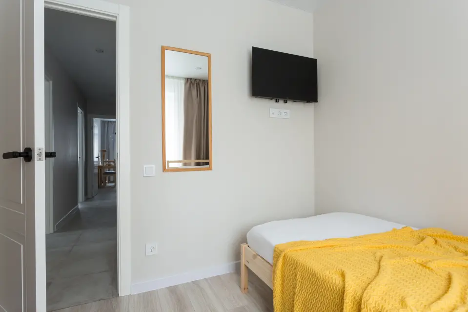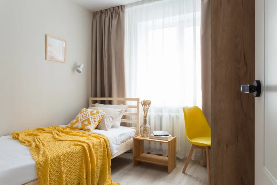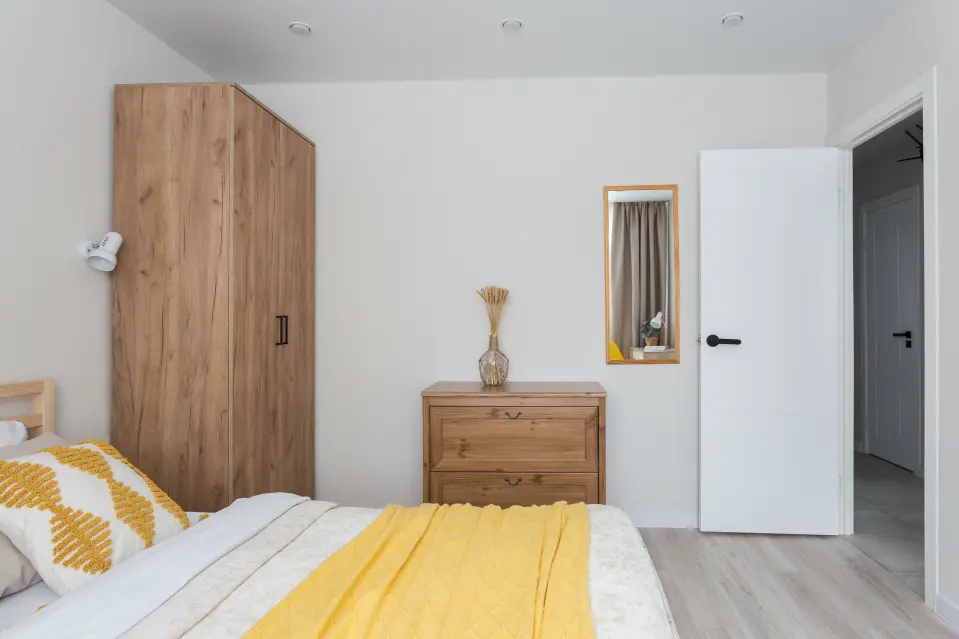 В первой спальне с акцентами желтого – удобная кровать и вместительный шкаф.