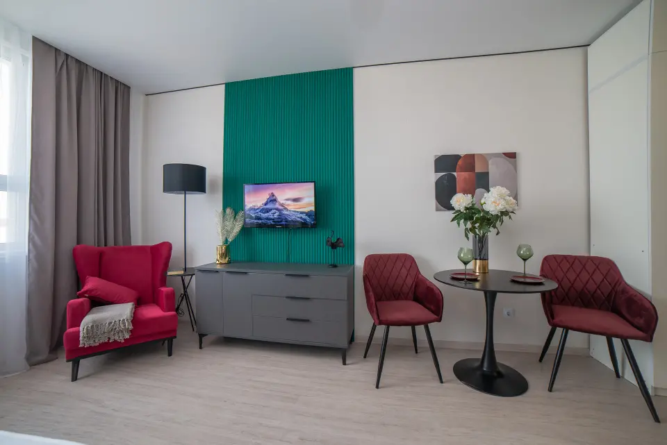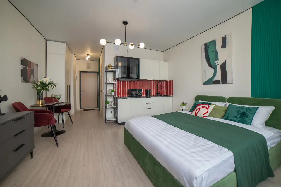 * Полноценная кухня (варочная панель, микроволновка, чайник)