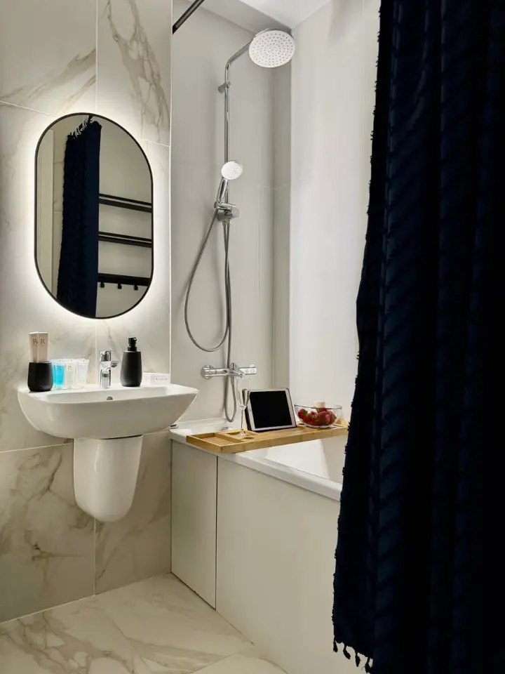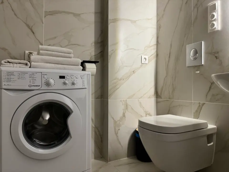 - Опрятная ванная комната с блестящими кранами и мягкими полотенцами, гигиеническими и косметическими наборами. Дополнительно присутствуют фен, утюг, сушилка.