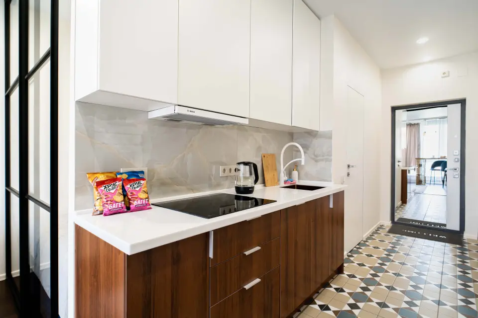 - Современная кухня в полной комплектации, словно приглашает к уютным завтракам или вечерним разговорам за бокалом вина. Мини-бар позволит вкусно перекусить в перерыве между делами.