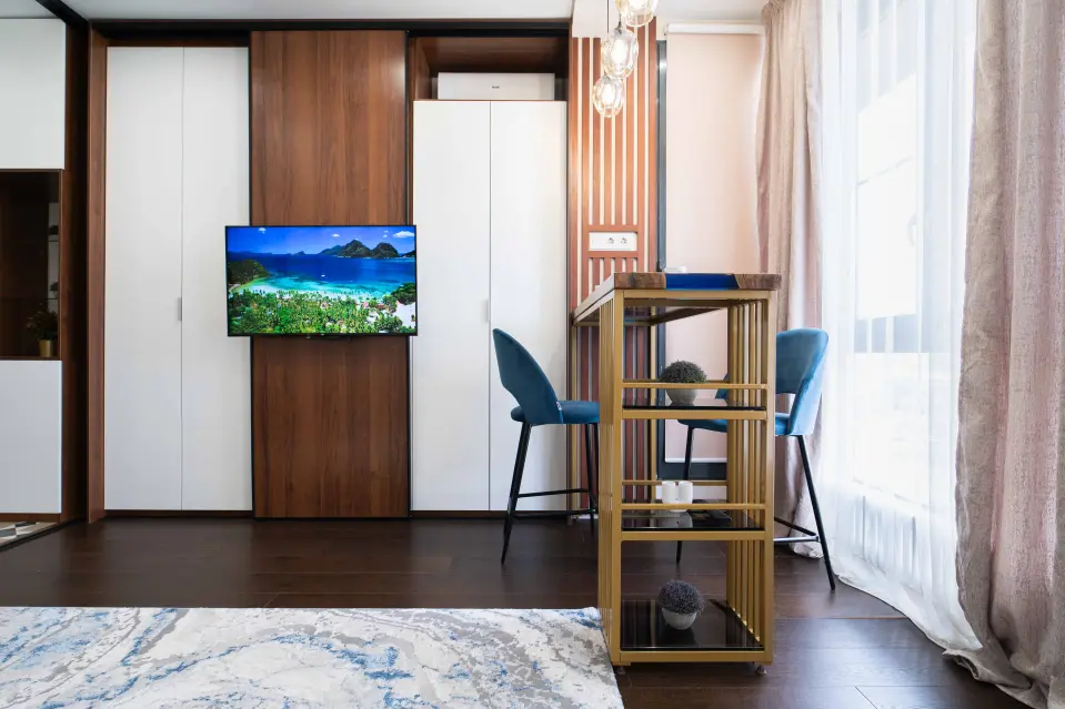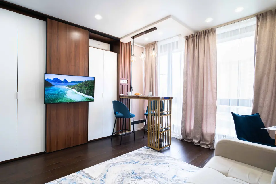 - Просторная кровать с удобным матрасом в изолированной зоне, постельным бельем из страйп-сатина, словно обнимает теплом, создавая обстановку для полного расслабления. Скоростной Wi-Fi и современное SMART TV.