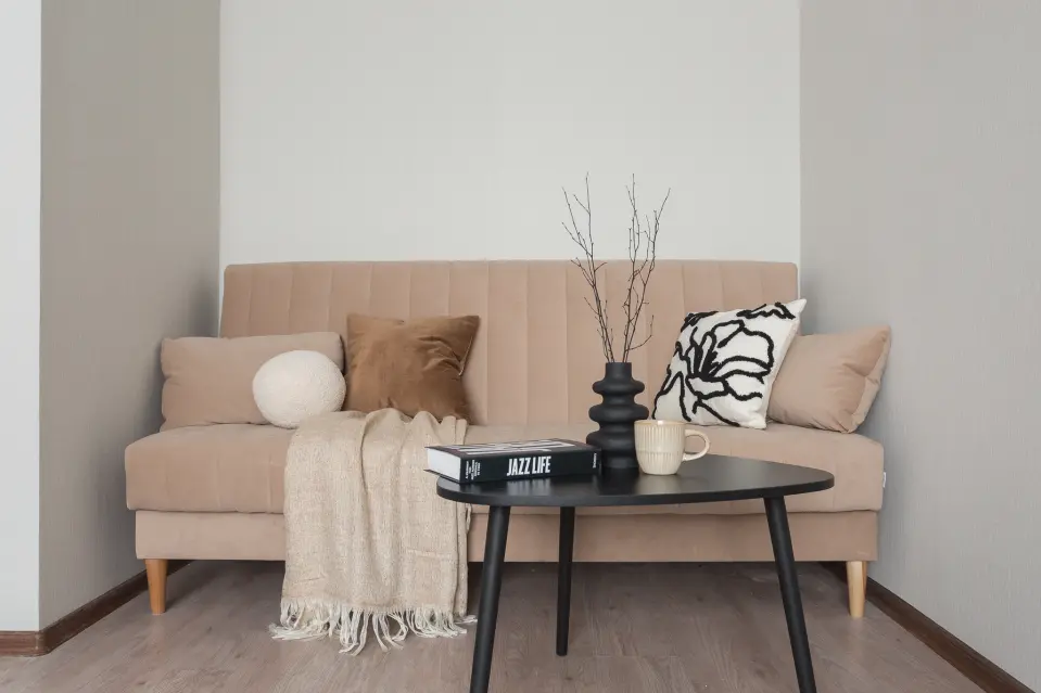 Гостиная зона с комфортным диваном приглашает расслабиться с любимой книгой или чашкой чая, а круглым журнальный столик добавляет элегантный штрих.
