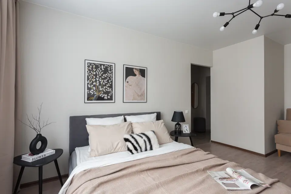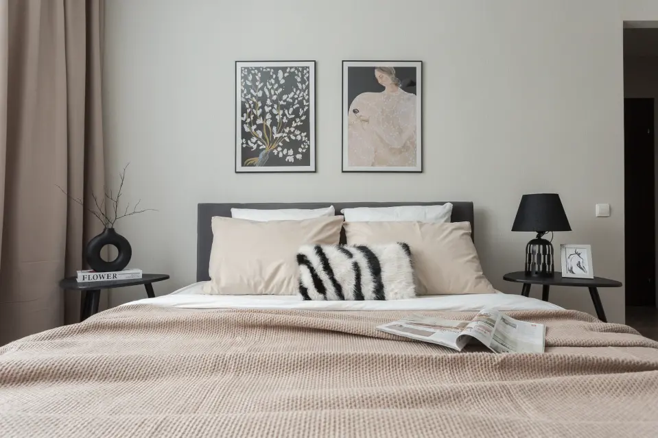 Мягкое постельное белье в сочетании с уютными декоративными подушками создают атмосферу домашнего уюта и безмятежности, а стильные картины на стенах придают интерьеру изысканность.