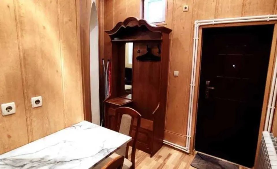 Однокомнатная квартира в историческом здании. Толстые каменные стены, высокие потолки. Тихий двор на берегу речки. Квартира на втором этаже, куда ведёт узкая длинная лестница. Вход в квартиру с длинной веранды.