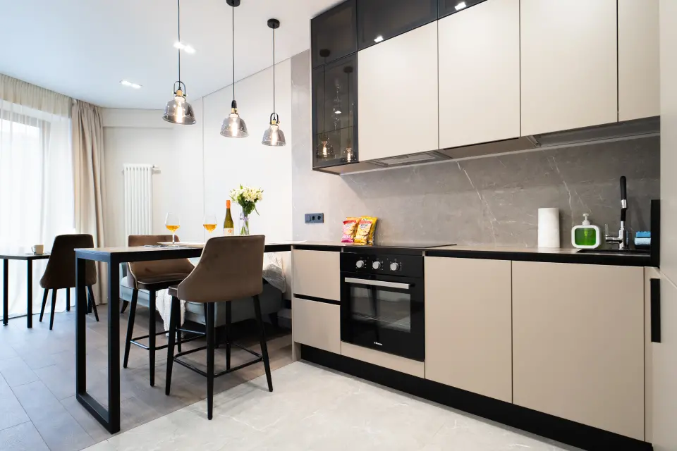 - Стильная кухня в полной комплектации. Мини-бар позволит вкусно перекусить в перерыве между делами.