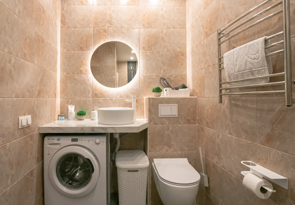 — Ванная «stone spa» — плитка под натуральный камень и зеркало с подсветкой создают атмосферу премиального спа